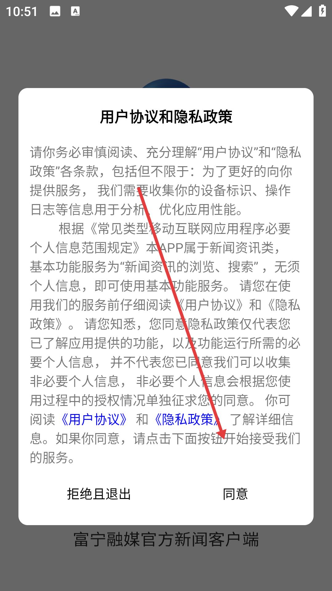 1、下載安裝完成后進(jìn)入,需在用戶協(xié)議和隱私政策界面點(diǎn)擊同意,接受相關(guān)條款后才能進(jìn)入應(yīng)用。