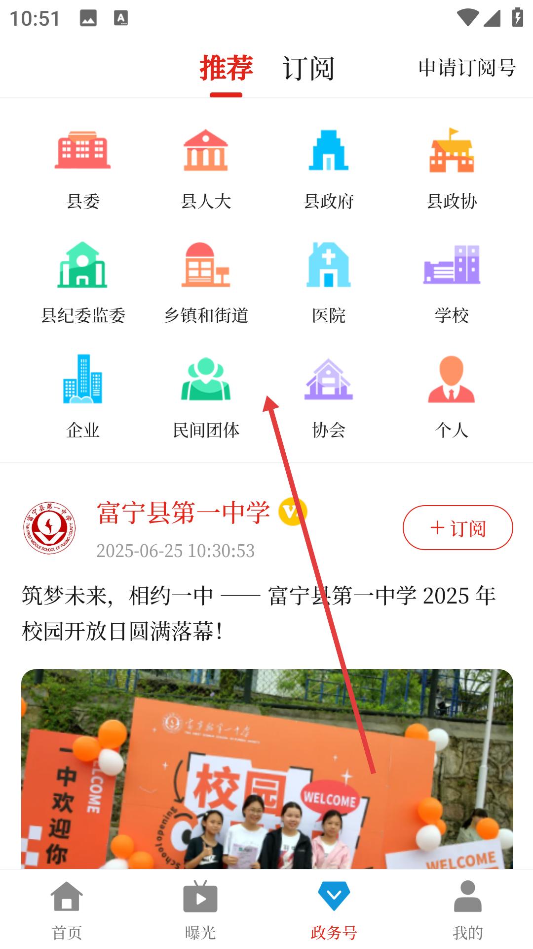 3、在該政務(wù)號(hào)頁(yè)面,有縣委、縣人大等眾多機(jī)構(gòu)類別圖標(biāo),下方展示了富寧縣第一中學(xué)2025年校園開(kāi)放日相關(guān)內(nèi)容,還可進(jìn)行訂閱操作。