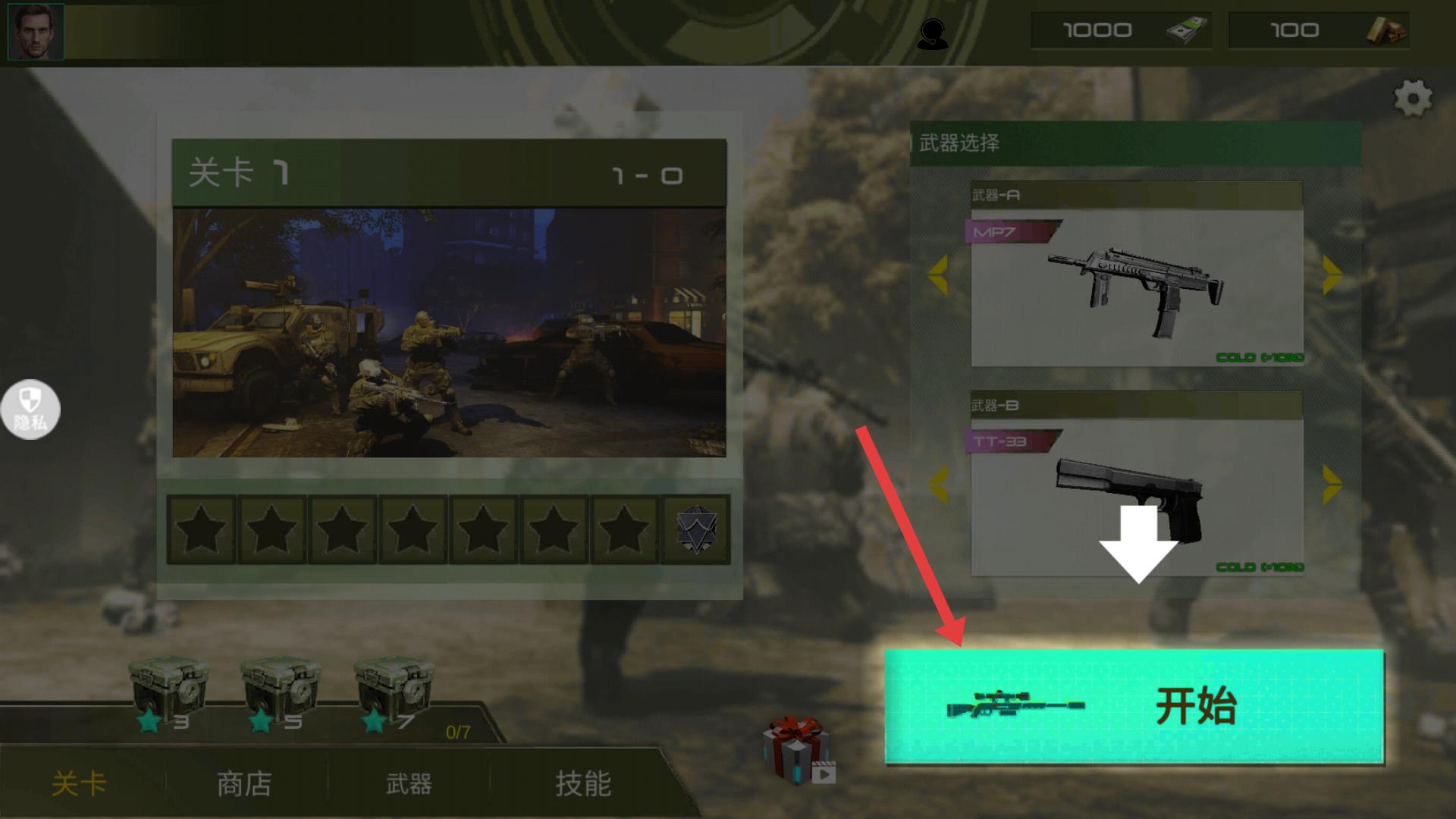 1、游戲關(guān)卡選擇界面,顯示關(guān)卡1及武器選擇,點(diǎn)擊開始按鈕,即可進(jìn)入關(guān)卡1,開啟戰(zhàn)斗。