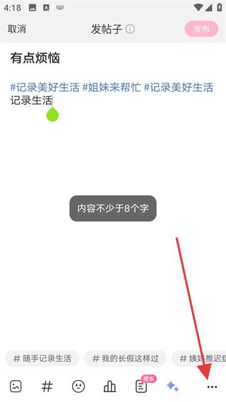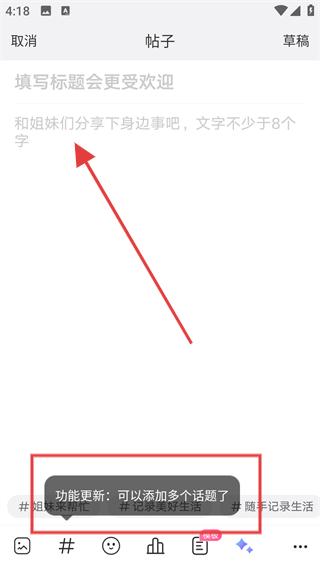 2、在帖子編輯頁面,先填寫標(biāo)題,再在正文區(qū)域輸入想分享的內(nèi)容,文字不少于8個字,還能利用功能添加多個話題,豐富帖子內(nèi)容。