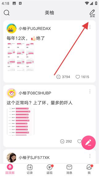 1、打開美柚APP,進(jìn)入主界面看到界面右上角的發(fā)貼按鈕,點(diǎn)擊該按鈕,進(jìn)入帖子編輯頁面,準(zhǔn)備撰寫要發(fā)布的內(nèi)容。