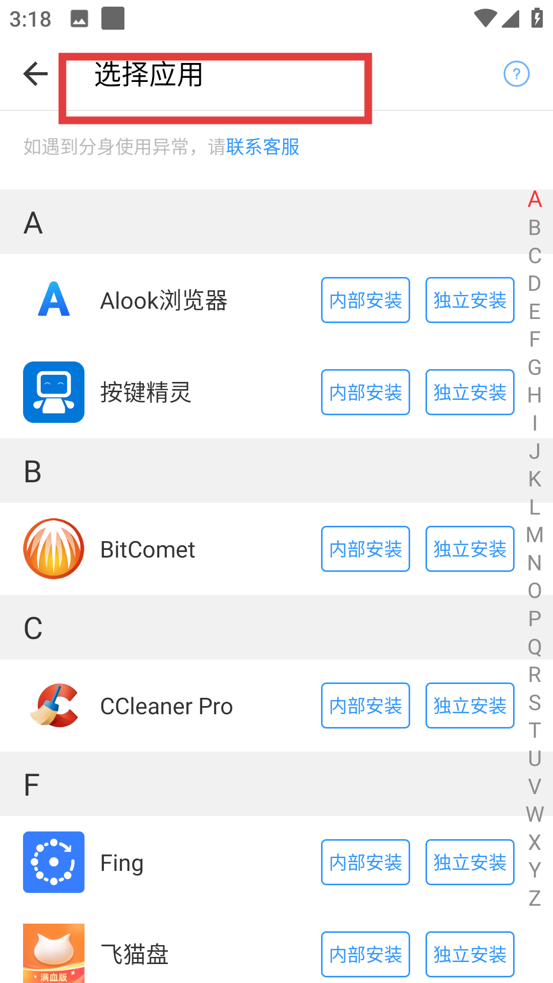 2、應(yīng)用頁面會列出手機(jī)中已安裝的應(yīng)用程序,找到想要創(chuàng)建分身的應(yīng)用,點(diǎn)擊應(yīng)用名稱右側(cè)的內(nèi)部安裝或獨(dú)立安裝按鈕,不同安裝方式在權(quán)限調(diào)用等方面可能有所差異。