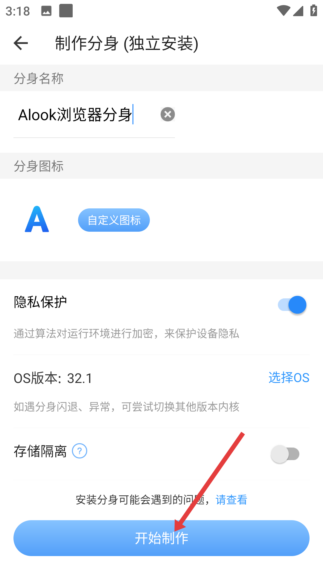 3、點(diǎn)擊安裝按鈕后進(jìn)入制作分身設(shè)置頁面,你可以自定義分身名稱等,還可按需開啟隱私保護(hù)等功能,完成設(shè)置后點(diǎn)擊開始制作,等待完成即可擁有應(yīng)用分身。