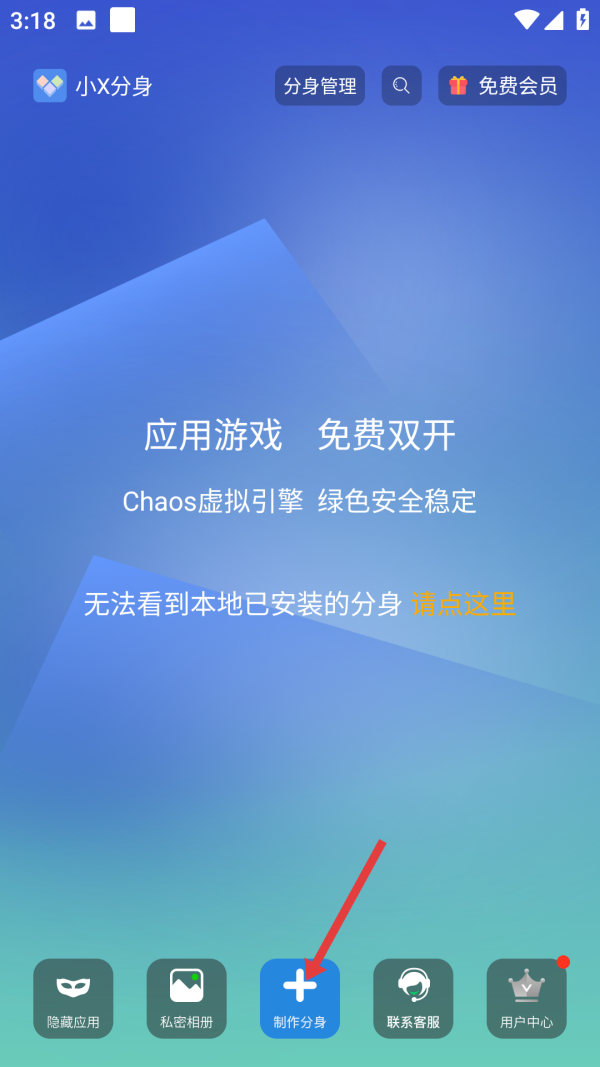 1、在主界面底部找到并點(diǎn)擊制作分身按鈕,該應(yīng)用主打應(yīng)用游戲雙開功能,通過點(diǎn)擊此按鈕你可以開始創(chuàng)建應(yīng)用或游戲的分身,以便同時使用多個賬號。
