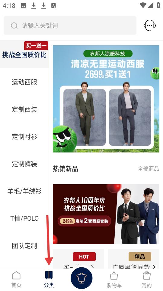 1、點(diǎn)擊分類首頁,具搜索功能,推買一送一活動,含運(yùn)動西服等服裝分類,展示新品促銷信息。