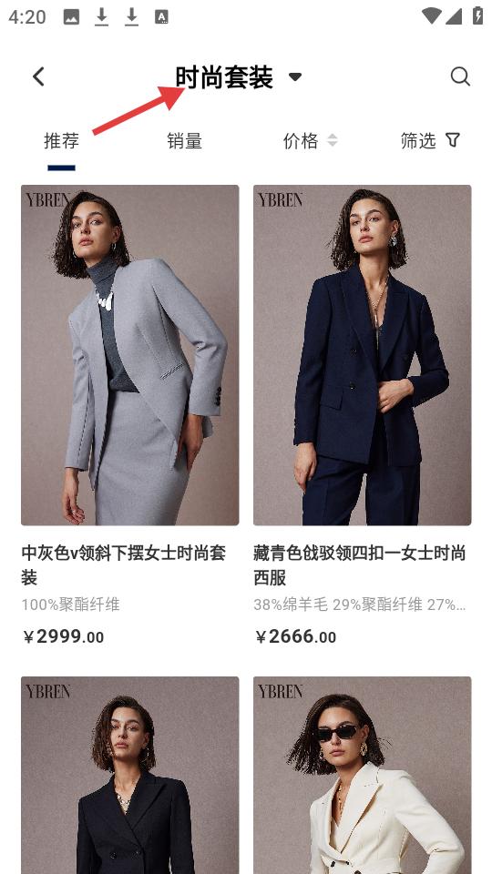 3、點(diǎn)擊時(shí)尚套裝界面,可按推薦等篩選,展示多款女士套裝,呈現(xiàn)名稱、材質(zhì)、價(jià)格等詳細(xì)商品信息。