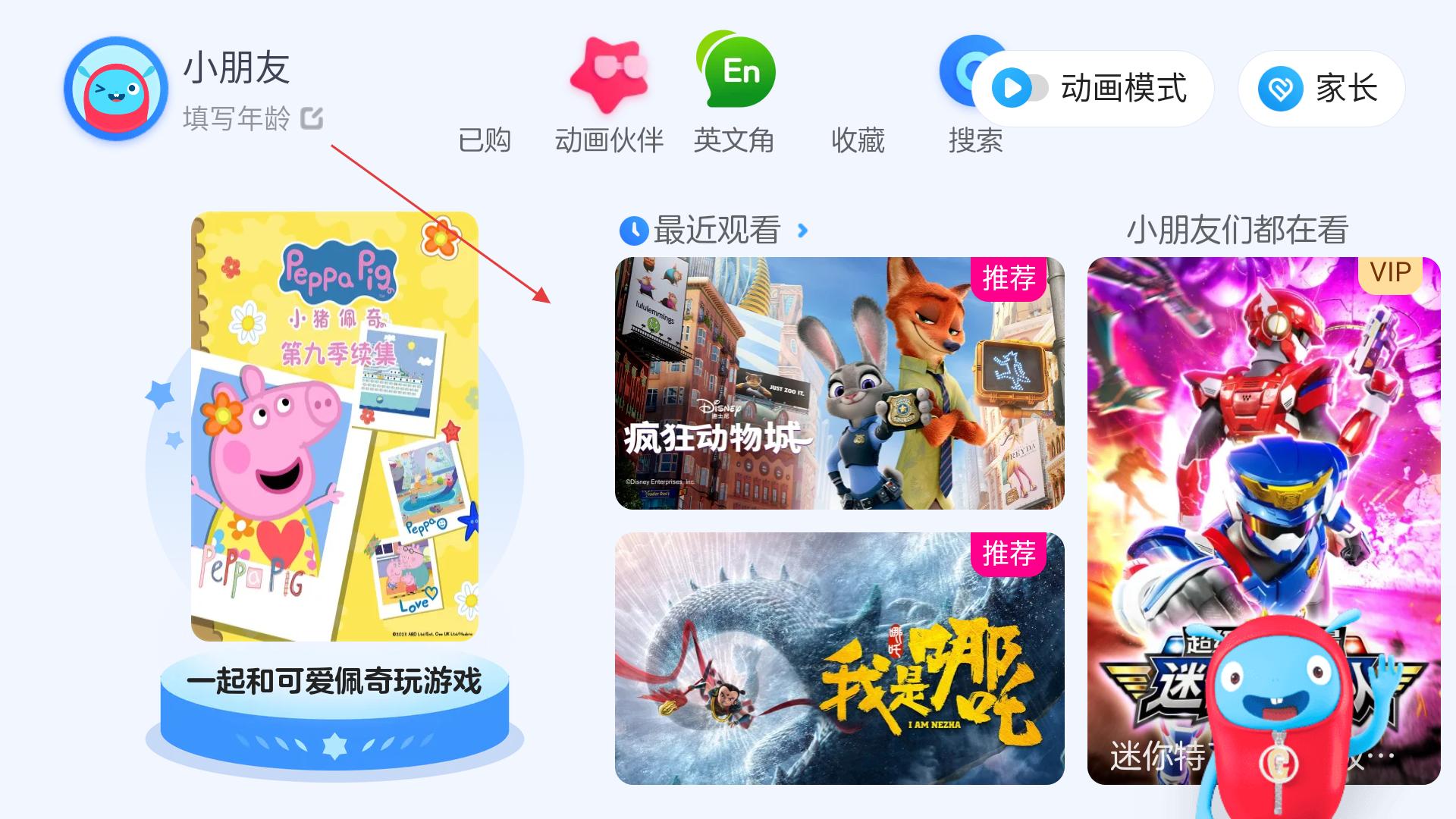 2、主界面,有已購、動(dòng)畫伙伴等多種功能入口,還展示了最近觀看和小朋友們都在看的動(dòng)畫內(nèi)容,如小豬佩奇第九季續(xù)集、瘋狂動(dòng)物城等。