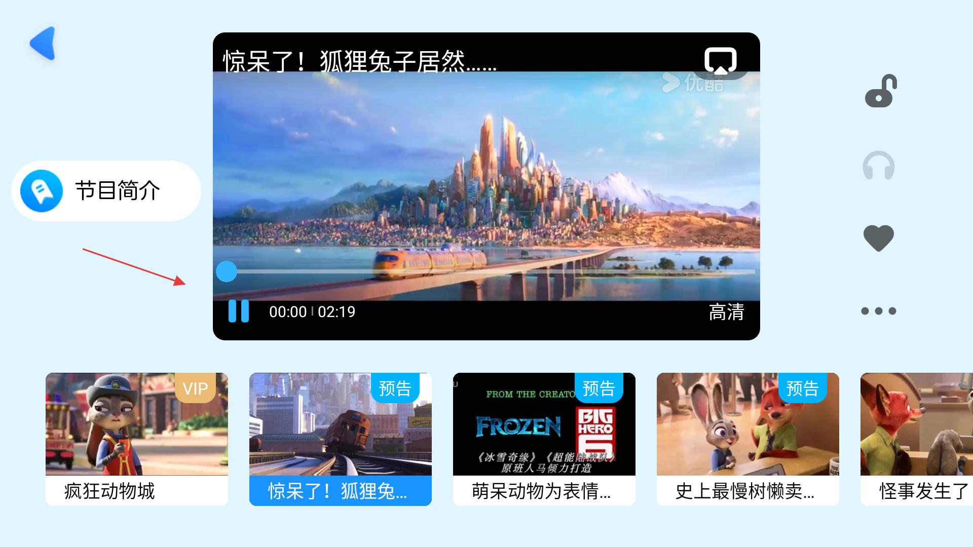 3、視頻播放界面,正在播放瘋狂動(dòng)物城相關(guān)視頻,用戶可查看節(jié)目簡(jiǎn)介,調(diào)整播放清晰度,還能瀏覽其他相關(guān)視頻推薦。