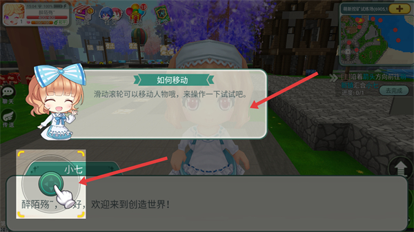 2、在游戲界面滑動滾輪可移動人物,按照提示操作移動人物,熟悉角色移動方式。