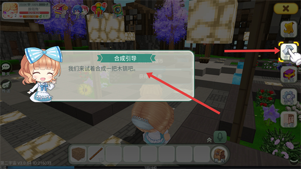 4、進行合成引導(dǎo),嘗試合成木鎬,點擊相關(guān)按鈕可進入合成界面,學(xué)習(xí)合成操作。