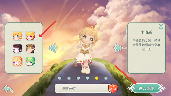 1、選擇小清新等角色,查看角色簡介后點擊進入游戲,開啟創(chuàng)造世界的冒險之旅。