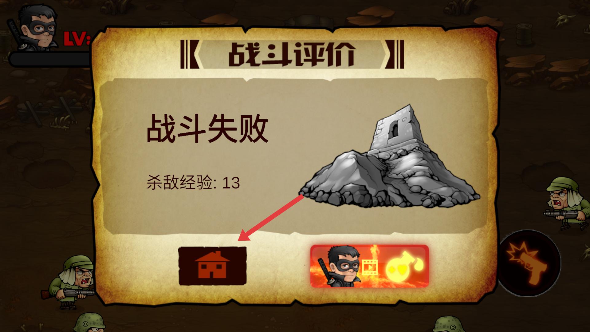 4、若戰(zhàn)斗失敗,界面會(huì)顯示戰(zhàn)斗失敗及殺敵經(jīng)驗(yàn)等信息,此時(shí)可點(diǎn)擊房屋圖標(biāo),返回主界面,重新準(zhǔn)備戰(zhàn)斗。