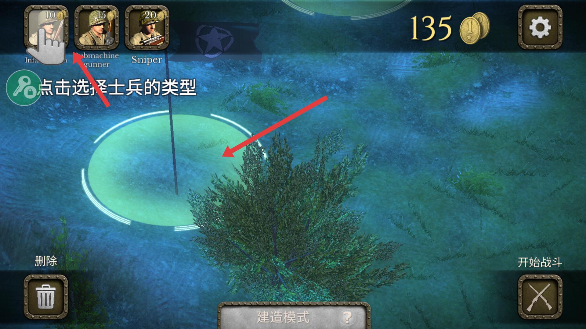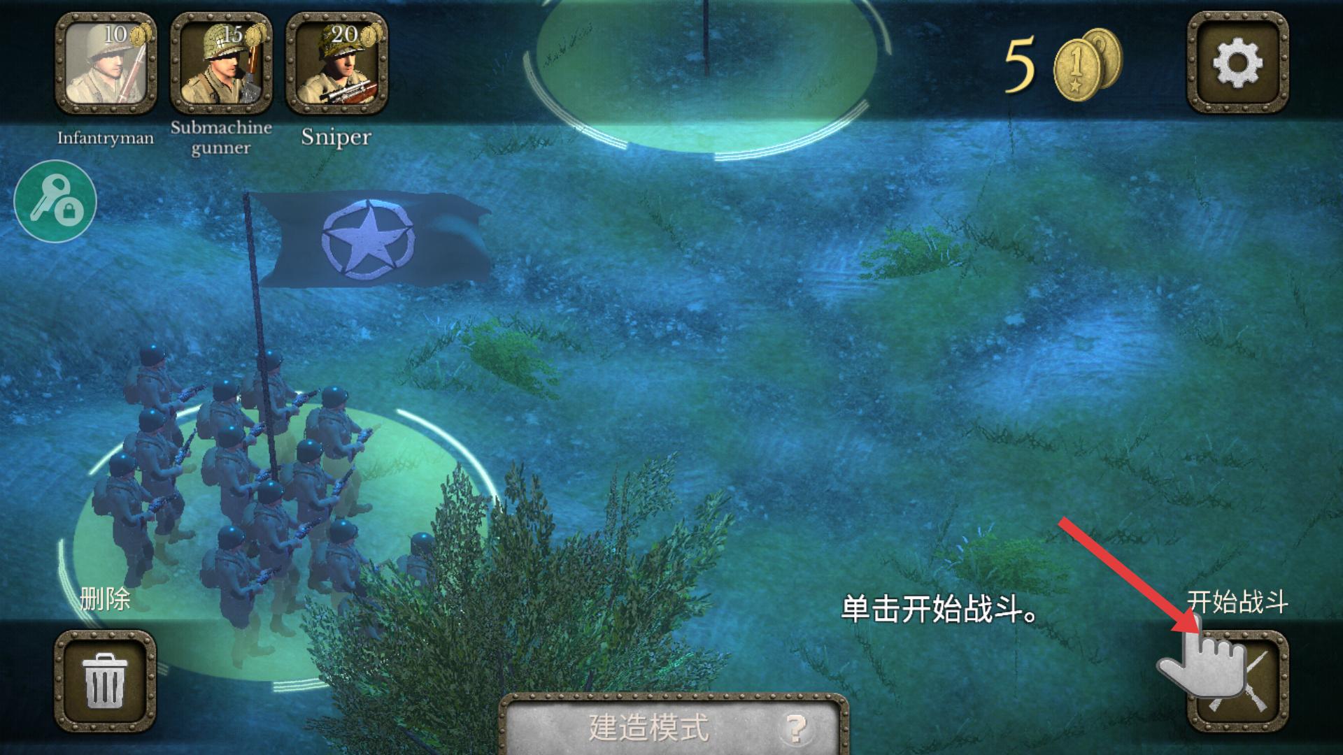 2、進(jìn)入游戲后,可選擇士兵類(lèi)型,如步兵、沖鋒槍兵等,點(diǎn)擊相應(yīng)士兵圖標(biāo),將士兵部署到綠色區(qū)域,為戰(zhàn)斗做準(zhǔn)備。