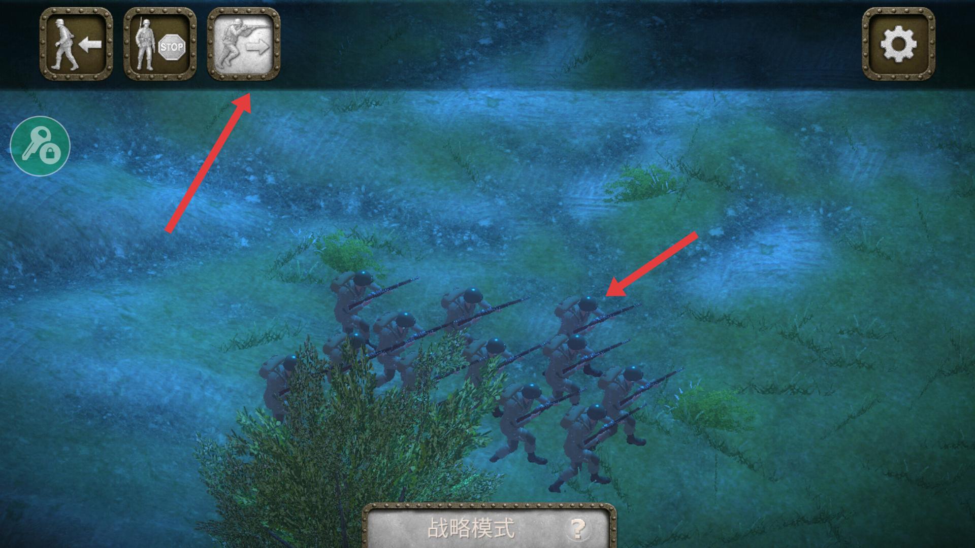 4、戰(zhàn)斗過(guò)程中,可使用上方的戰(zhàn)略模式按鈕,如前進(jìn)、停止、攻擊等,指揮士兵行動(dòng),合理運(yùn)用戰(zhàn)略,提升戰(zhàn)斗勝算。