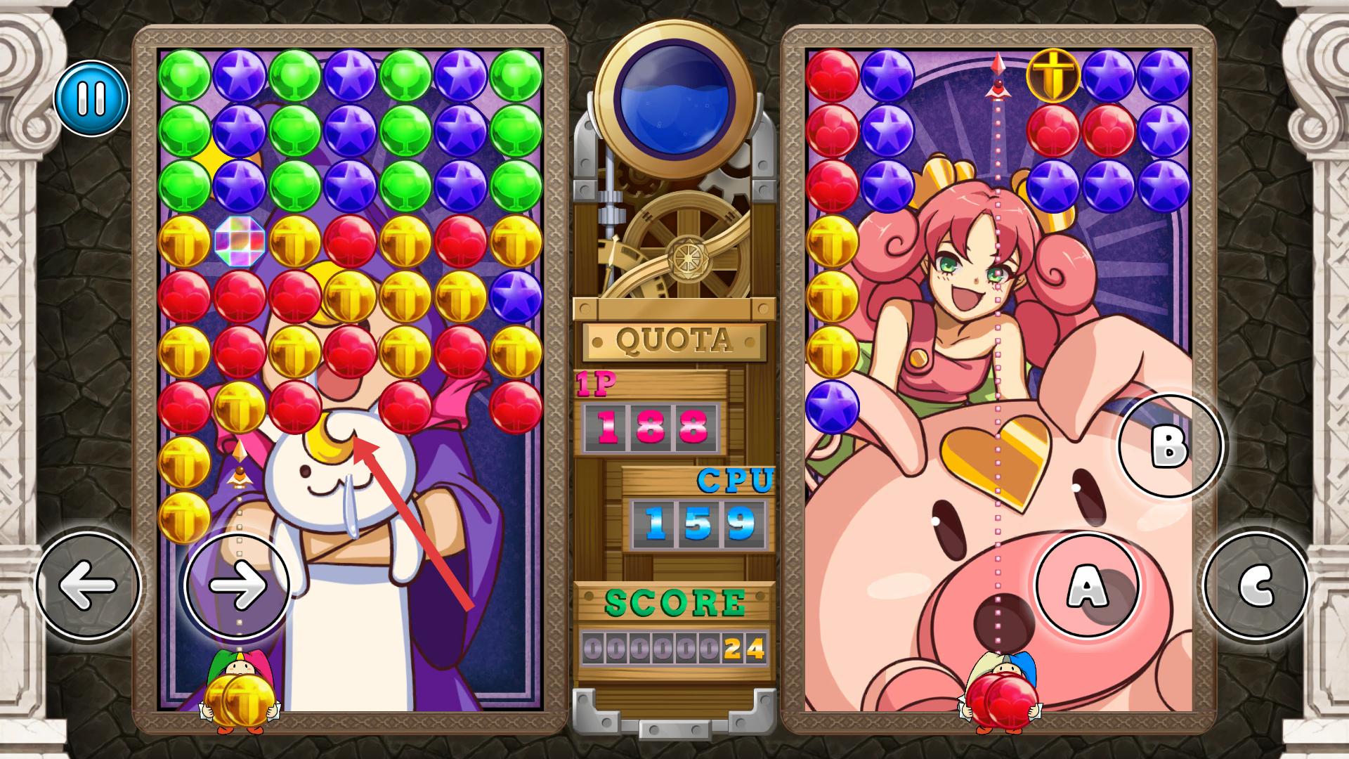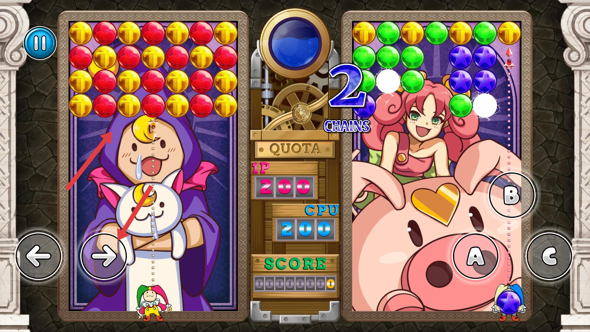2、進(jìn)入游戲后,操控角色,利用左右方向鍵移動(dòng),瞄準(zhǔn)相同顏色的泡泡,點(diǎn)擊相關(guān)按鍵進(jìn)行消除,積累分?jǐn)?shù)。