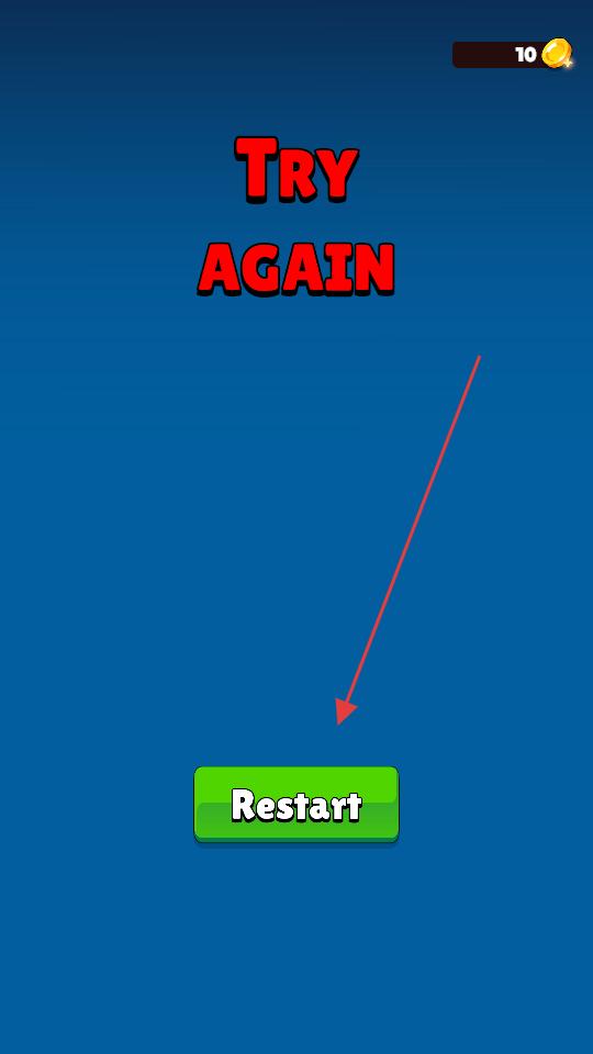 4、若挑戰(zhàn)失敗顯示TRYAGAIN,點(diǎn)擊綠色Restart按鈕,重新開始Level1的挑戰(zhàn),再次操控飛機(jī)進(jìn)行射擊冒險(xiǎn),爭(zhēng)取順利通關(guān)。