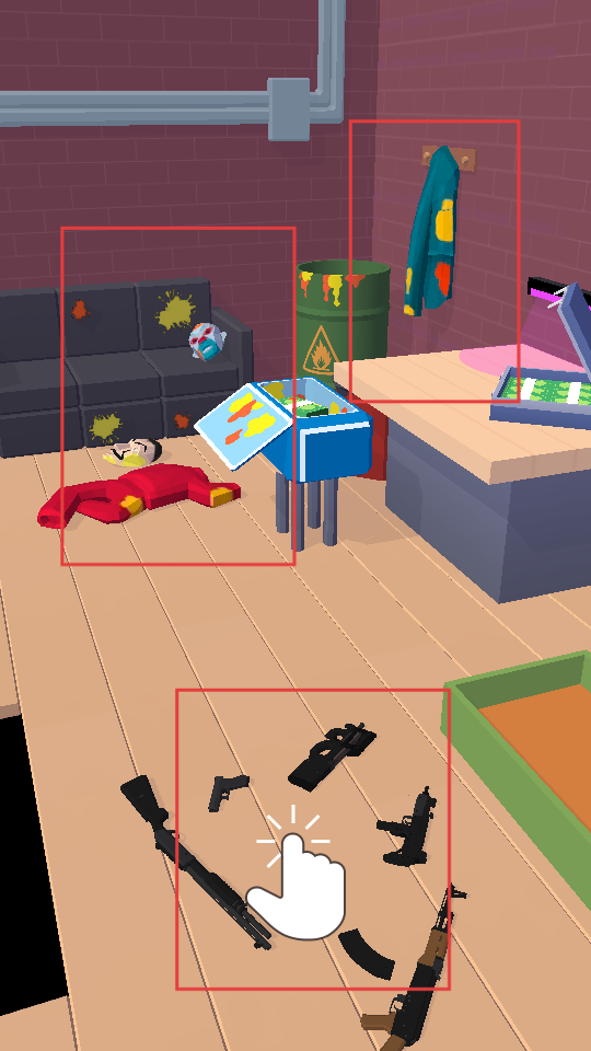 1、進入游戲場景,觀察到房間的衣服、沙發(fā)與面具都沾染著血液,點擊屏幕就能開始游戲。