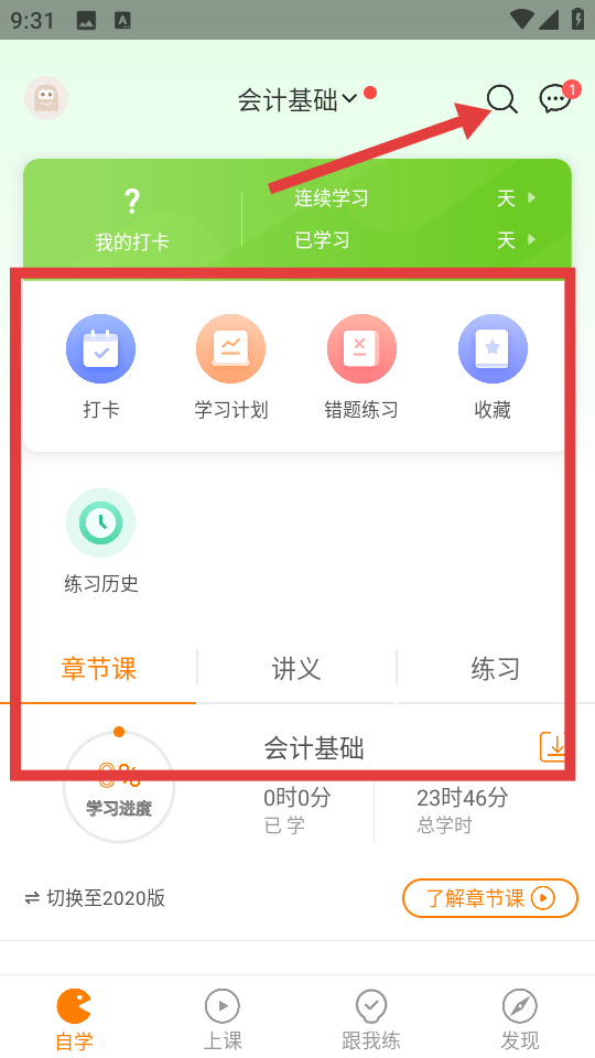 1、在自學頁面中有打卡、學習計劃、錯題練習、收藏、練習歷史等功能,還有章節(jié)課、講義、練習等板塊,這些功能和板塊有助于你規(guī)劃學習進程、鞏固知識。