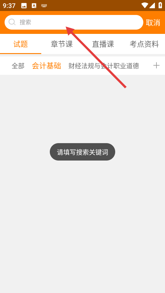 2、點擊自學頁面右上角的搜索圖標,即可進入搜索界面,在搜索欄輸入關鍵詞,能快速查找試題、章節(jié)課、直播課、考點資料等內(nèi)容,幫你精準定位所需學習資源。