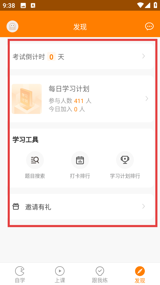 3、發(fā)現(xiàn)頁面考試倒計時能提醒你剩余備考時間,每日學習計劃可讓你了解學習進度和他人參與情況,學習工具里的題目搜索等功能,能助力你更好地學習和與他人比較。