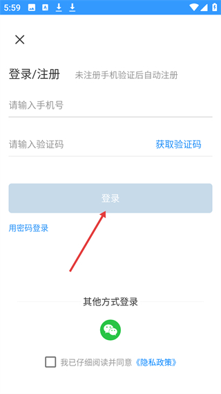 1、登錄注冊(cè)界面可通過輸入手機(jī)號(hào)、獲取驗(yàn)證碼登錄,未注冊(cè)手機(jī)號(hào)驗(yàn)證后自動(dòng)注冊(cè),也可用密碼或微信等其他方式登錄,需同意隱私政策。