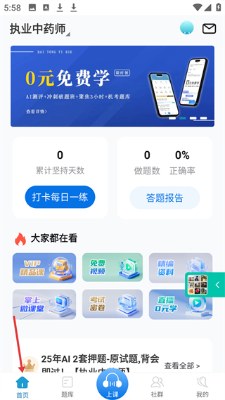 2、首頁(yè)有0元免費(fèi)學(xué)活動(dòng),展示累計(jì)堅(jiān)持天數(shù)、做題數(shù)等數(shù)據(jù),還有VIP精品課、免費(fèi)視頻等學(xué)習(xí)資源板塊。