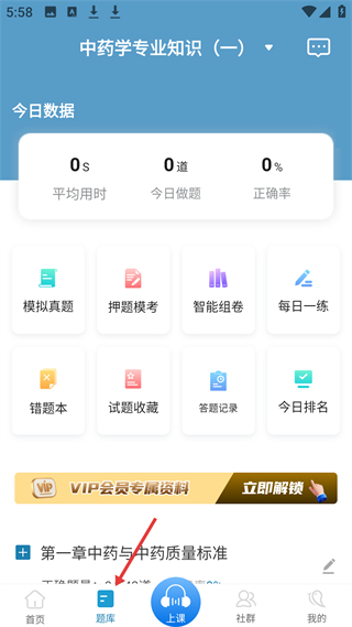 3、中藥學(xué)專業(yè)知識(shí)一頁(yè)面,呈現(xiàn)今日做題數(shù)據(jù),有模擬真題等功能入口,可查看VIP專屬資料,學(xué)習(xí)中藥質(zhì)量標(biāo)準(zhǔn)等內(nèi)容。
