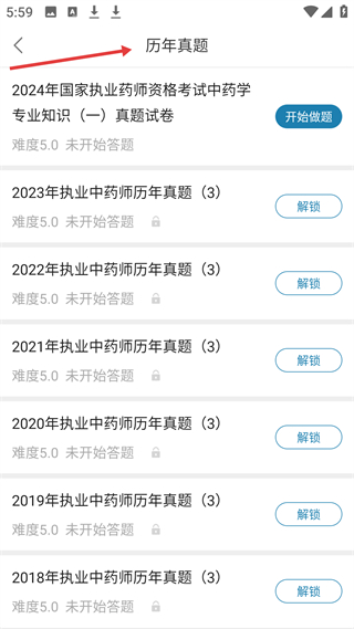 4、歷年真題頁(yè)面列出2018、2024年執(zhí)業(yè)中藥師中藥學(xué)專業(yè)知識(shí)一真題試卷,2024年試卷可直接開始做題,其余年份試卷需解鎖。