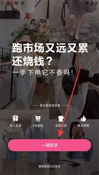 1、打開一手女裝服裝批發(fā)軟件,進(jìn)入首頁(yè)看到一鍵登錄按鈕,點(diǎn)擊該按鈕,進(jìn)入輸入手機(jī)號(hào)頁(yè)面,準(zhǔn)備進(jìn)行登錄操作,首次登錄還有驚喜。