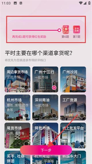 3、登錄后進(jìn)入問卷頁(yè)面,回答平時(shí)主要在哪個(gè)渠道拿貨呢的問題,選擇對(duì)應(yīng)的拿貨渠道,然后點(diǎn)擊下一步,完成問卷答題。