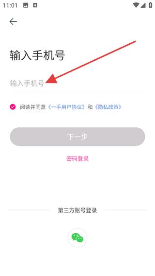 2、在輸入手機(jī)號(hào)頁(yè)面,輸入自己的手機(jī)號(hào)碼,勾選閱讀并同意一手用戶協(xié)議和隱私政策,然后點(diǎn)擊下一步,繼續(xù)登錄流程。