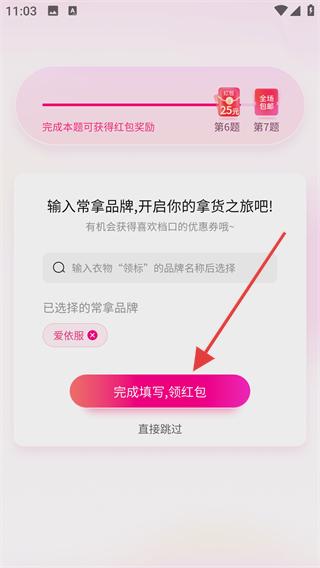 4、在輸入常拿品牌頁(yè)面,輸入常拿的品牌,若有已選擇的常拿品牌,確認(rèn)無(wú)誤后,點(diǎn)擊完成填寫領(lǐng)紅包,領(lǐng)取紅包獎(jiǎng)勵(lì)。
