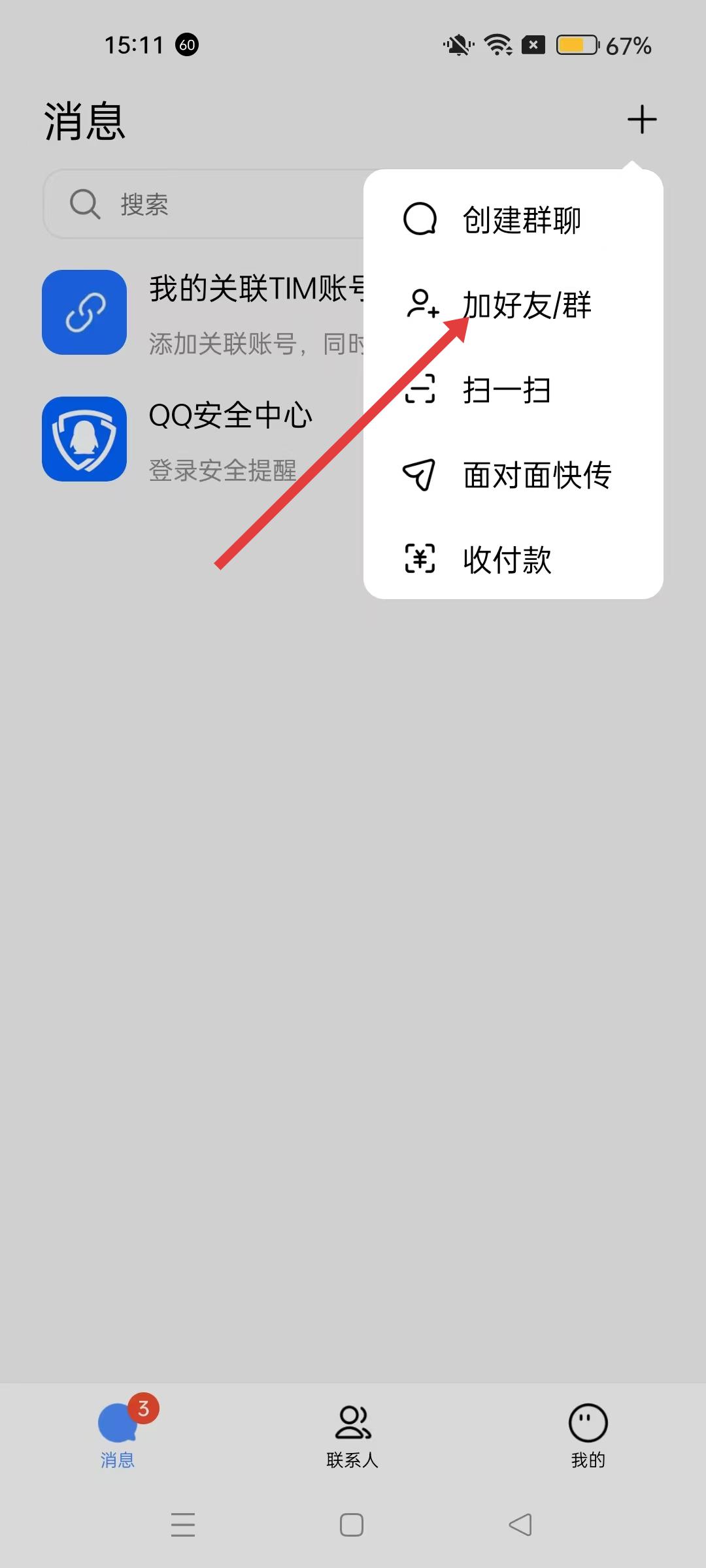 2、然后再功能選項(xiàng)菜單中點(diǎn)擊加好友、群選項(xiàng),進(jìn)入添加頁(yè)面。