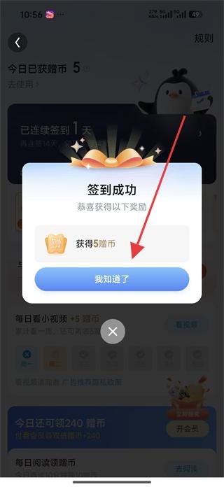 2、簽到成功后,可以獲得5個(gè)金幣,點(diǎn)擊下方的知道了,也可以進(jìn)行補(bǔ)簽。