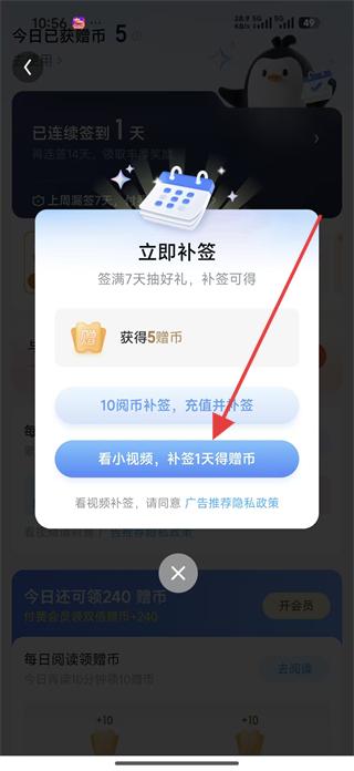 3、在簽到頁(yè)面若有補(bǔ)簽需求,可選擇看小視頻補(bǔ)簽1天得贈(zèng)幣,完成補(bǔ)簽后,會(huì)顯示簽到成功,獲得相應(yīng)閱幣。