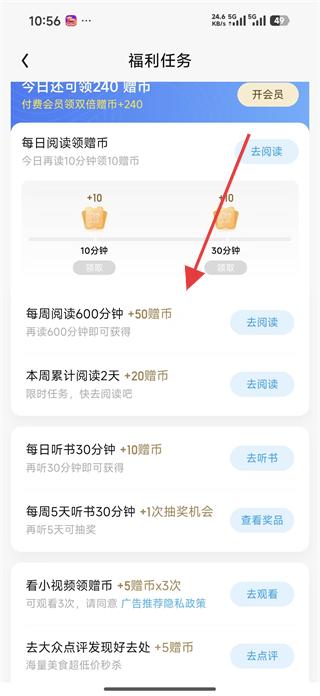 4、簽到完成后進(jìn)入福利任務(wù)頁(yè)面,可看到每日閱讀、每周閱讀、聽(tīng)書(shū)等多種獲取閱幣的任務(wù)。