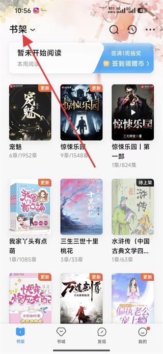 1、打開(kāi)QQ閱讀APP,進(jìn)入書(shū)架頁(yè)面,查看已添加的小說(shuō),然后點(diǎn)擊簽到領(lǐng)贈(zèng)幣,進(jìn)入簽到頁(yè)面。