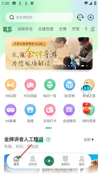 1、首頁有搜索欄,設(shè)VR云游、3D文物等功能入口,推金牌導(dǎo)游現(xiàn)場解讀,還有金牌講者精講板塊,底部有功能欄。