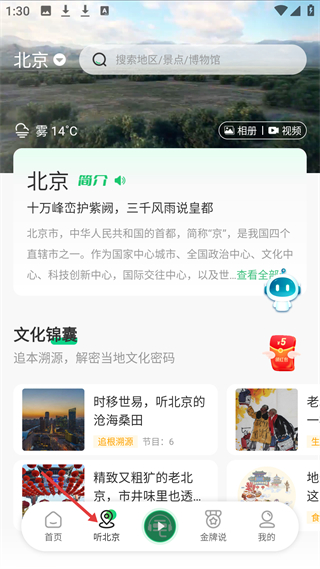 2、聽北京板塊展示北京簡介、天氣,文化錦囊欄有北京文化內(nèi)容,提供當(dāng)?shù)匚幕庾x,底部有功能欄。