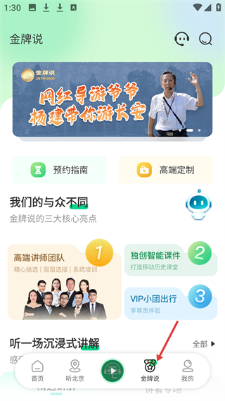 3、金牌說板塊推網(wǎng)紅導(dǎo)游游長安服務(wù),介紹高端講師團(tuán)隊等亮點,有沉浸式講解板塊,底部功能欄可切換頁面。
