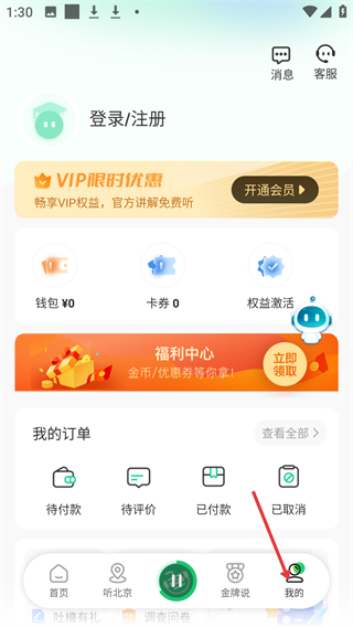 4、我的板塊有登錄注冊入口、VIP限時優(yōu)惠,還有錢包、卡券等功能,展示我的訂單分類,底部功能欄可切換至其他板塊。