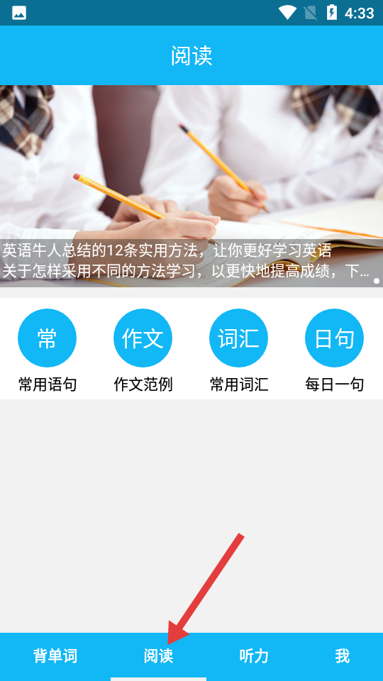 2、閱讀頁面頂部推薦英語學(xué)習(xí)方法文章,下方細(xì)分常用語句、作文范例等模塊,助力提升英語閱讀與寫作能力。
