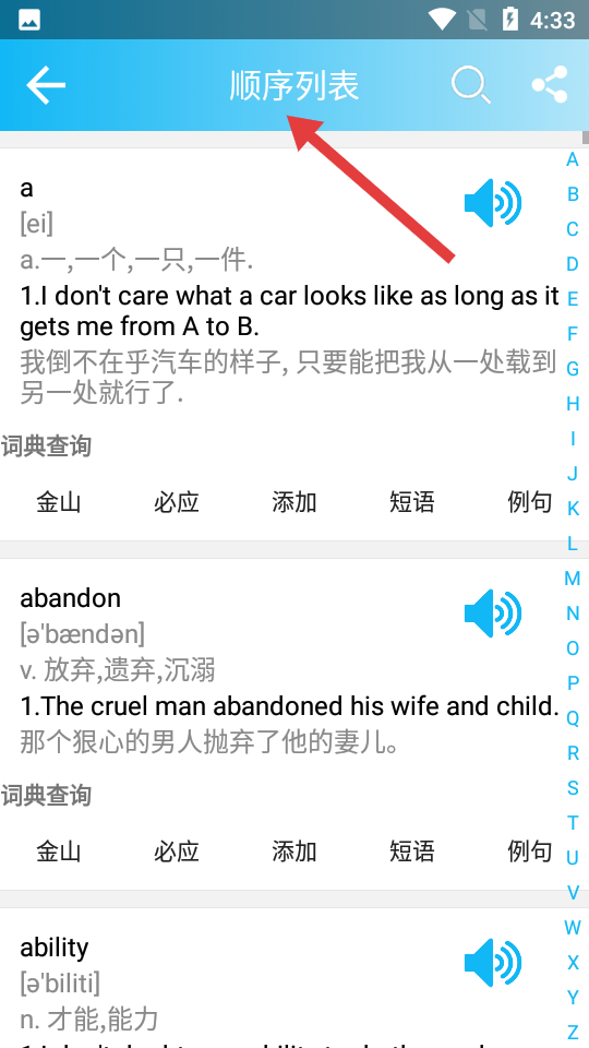 3、順序列表頁面單詞依字母順序排列,附帶音標(biāo)、詞義及例句,部分支持語音播放,還能進(jìn)行詞典查詢等操作。