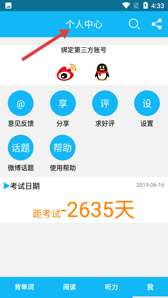 4、個人中心頁面支持綁定第三方賬號,涵蓋意見反饋等功能,醒目顯示考試日期與倒計時天數(shù),方便用戶管理學(xué)習(xí)進(jìn)程。