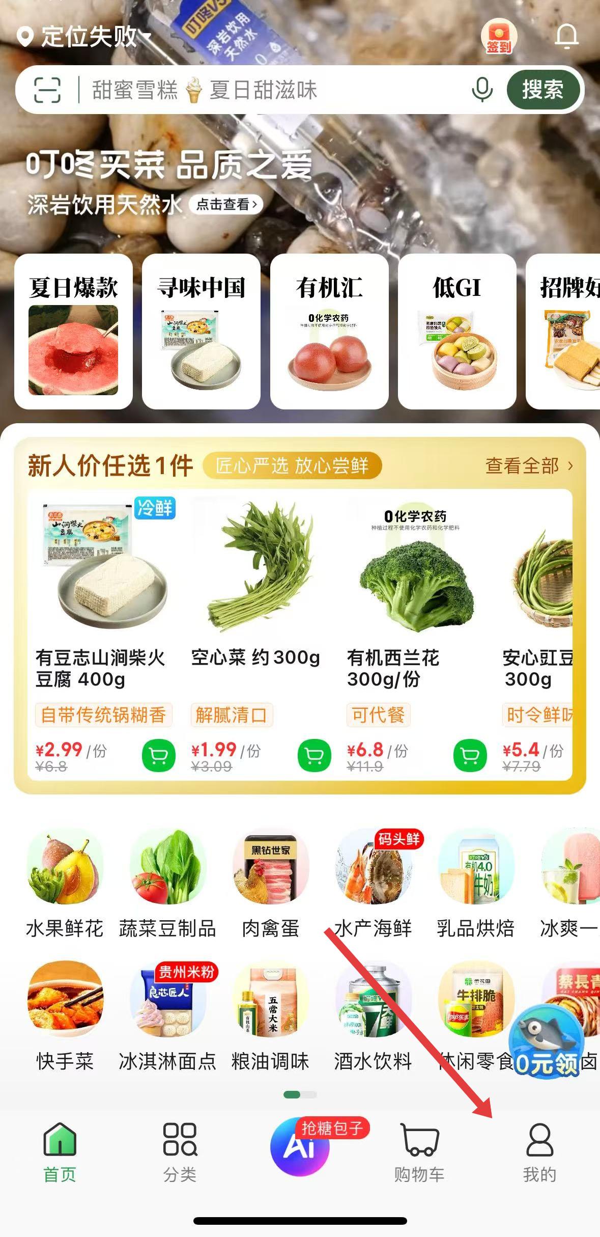 1、叮咚買菜首頁,分類多樣,新人專享優(yōu)惠醒目,點擊底部我的,可進入個人中心管理賬號。