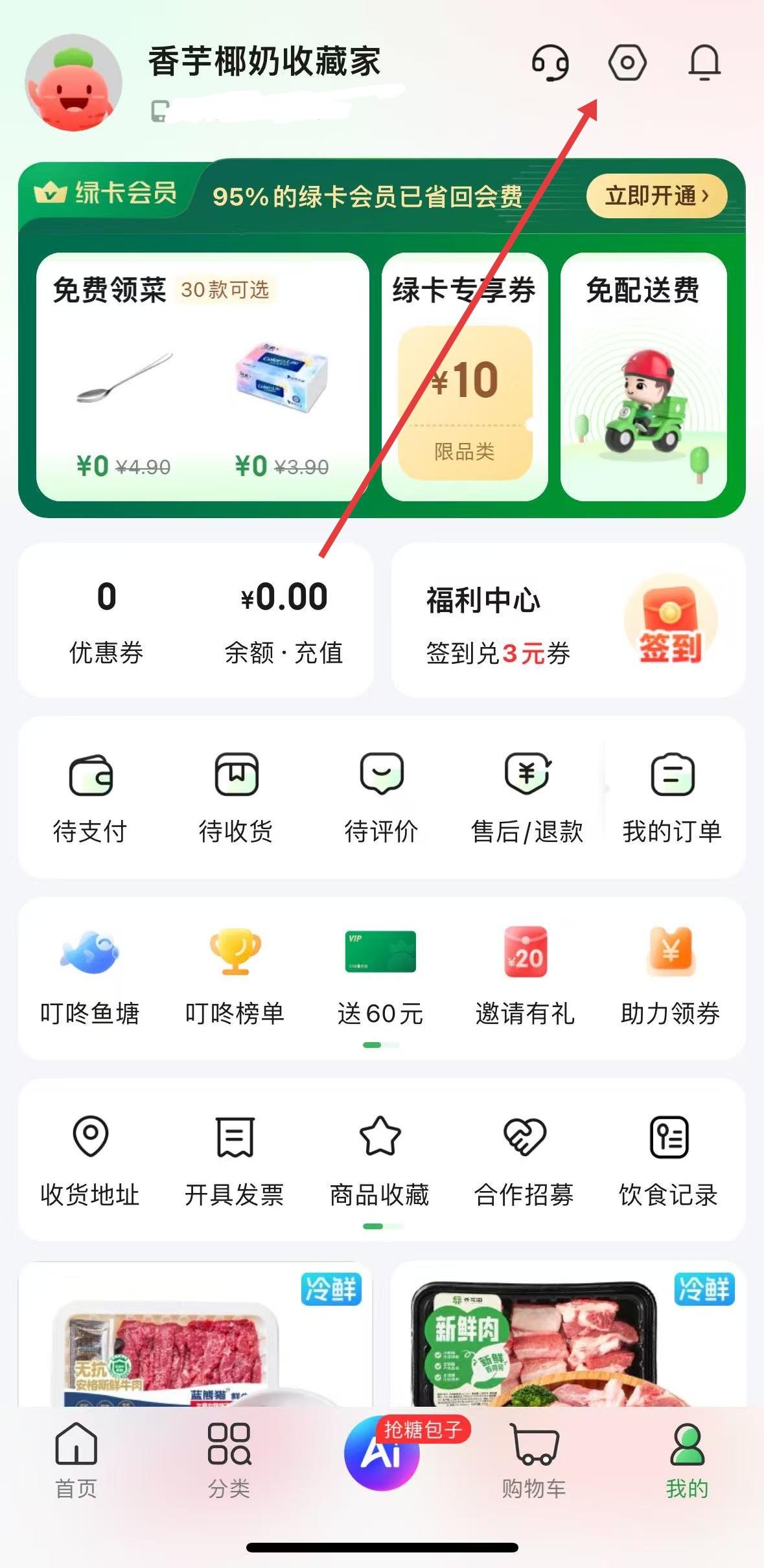 2、我的頁面有綠卡會員等權益,點右上角設置圖標,能進入設置界面,調整APP相關配置。