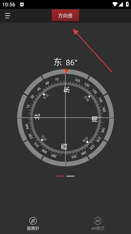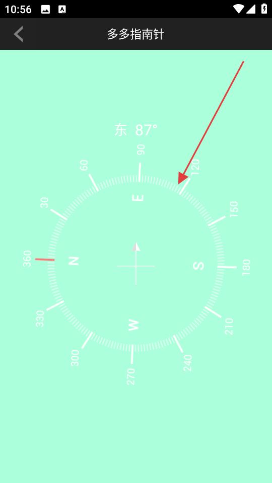 2、切換至指南針模式,界面呈現(xiàn)簡潔羅盤,依據(jù)羅盤上的刻度、方位標(biāo)識,配合手機(jī)轉(zhuǎn)動(dòng),精準(zhǔn)獲取所處方向信息。