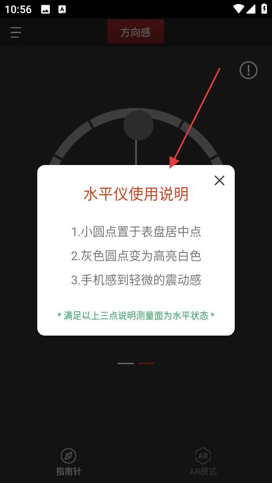 3、若用水平儀功能,查看水平儀使用說明,按提示將小圓點(diǎn)置于表盤居中點(diǎn),待灰色圓點(diǎn)變高亮白色且手機(jī)有輕微震動(dòng),即測量面為水平狀態(tài)。