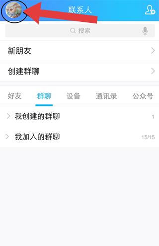 1、打開QQ的聯(lián)系人界面,找到并點(diǎn)擊左上角顯示的個(gè)人頭像,呼出側(cè)邊功能欄。