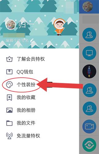 2、在呼出的側(cè)邊欄里找到標(biāo)注為個(gè)性裝扮的選項(xiàng)并點(diǎn)擊,進(jìn)入個(gè)性裝扮專屬頁面。